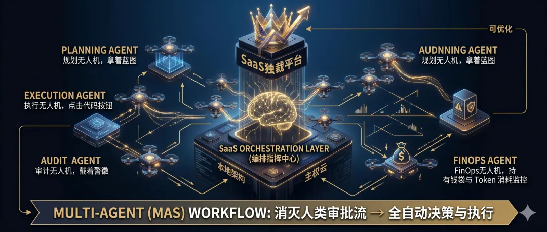 未来的企业,可能根本没有“部门”这个概念,只有被SaaS平台统一调度的“AI智能体集群” 。单体AI正在被加速淘汰,SaaS平台正在进化为一个庞大的SaaS Orchestration Layer(编排指挥中心) 。