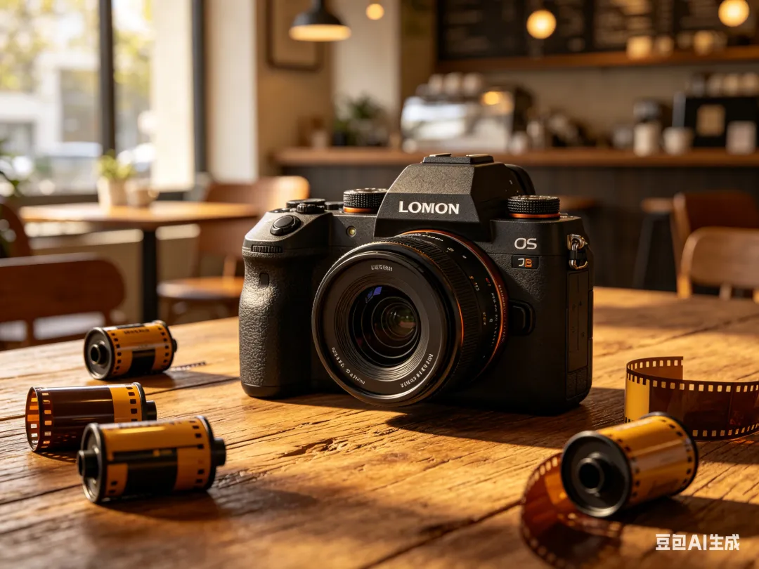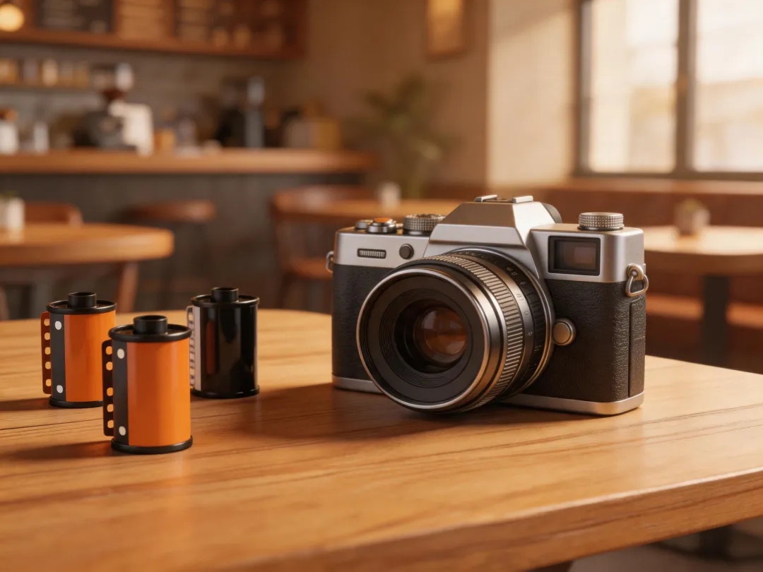 示例2:图片风格为「3D渲染」,主体是一款数码相机,位于木纹桌面上。背景是咖啡馆室内,窗外有自然光射入。画面前景有几个散落的胶卷。整体色调偏暖棕色,2K分辨率,超高清细节。