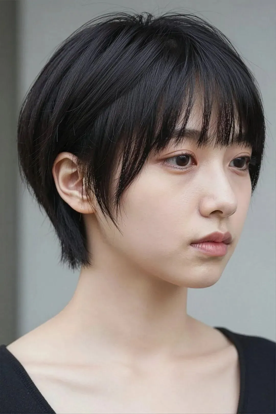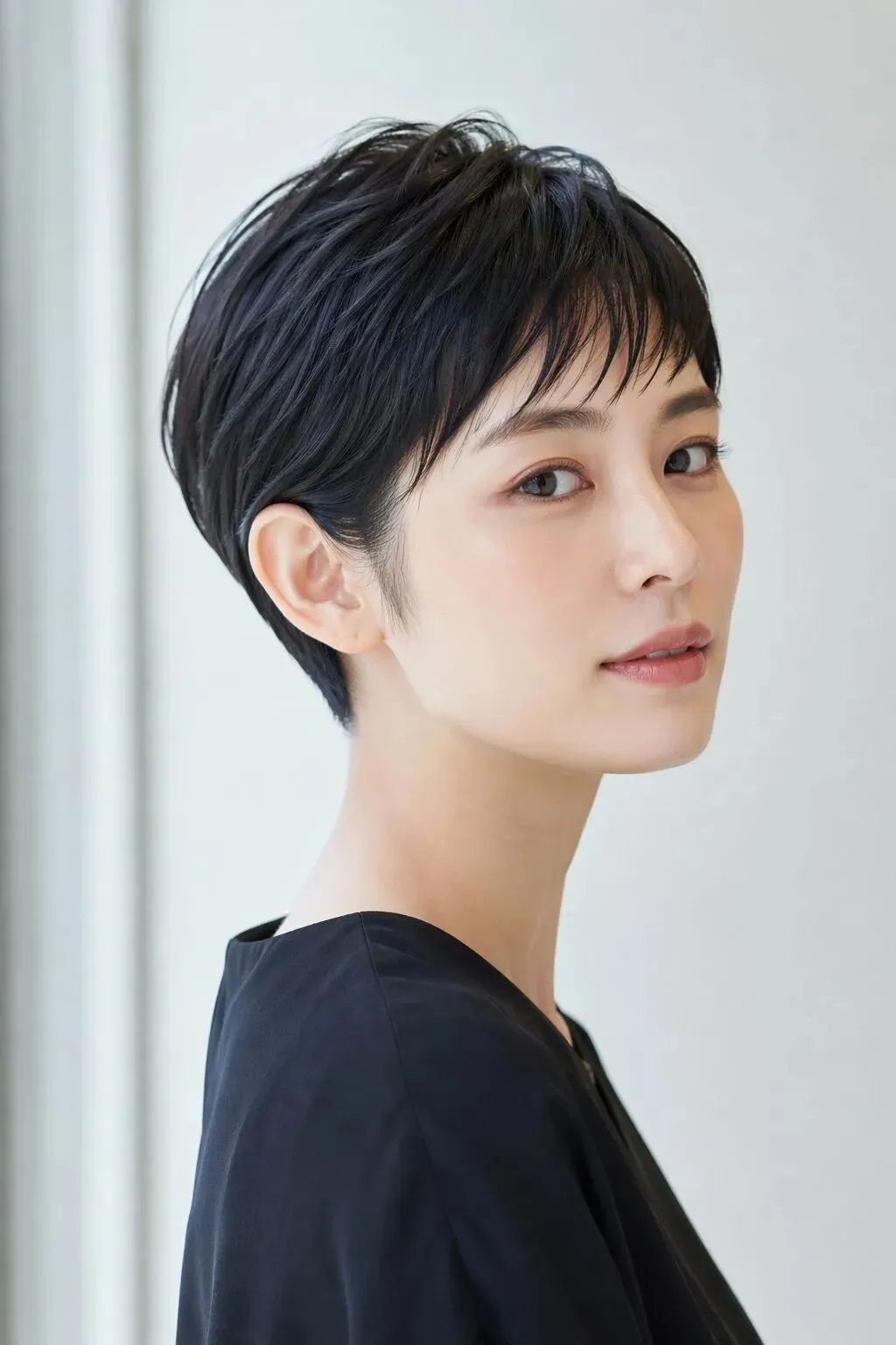 beautiful urban Japanese woman in her 20s, hairstyle-focused beauty portrait,the focus is the haircut, she has a true feminine pixie cut, ultra-short overall length,
