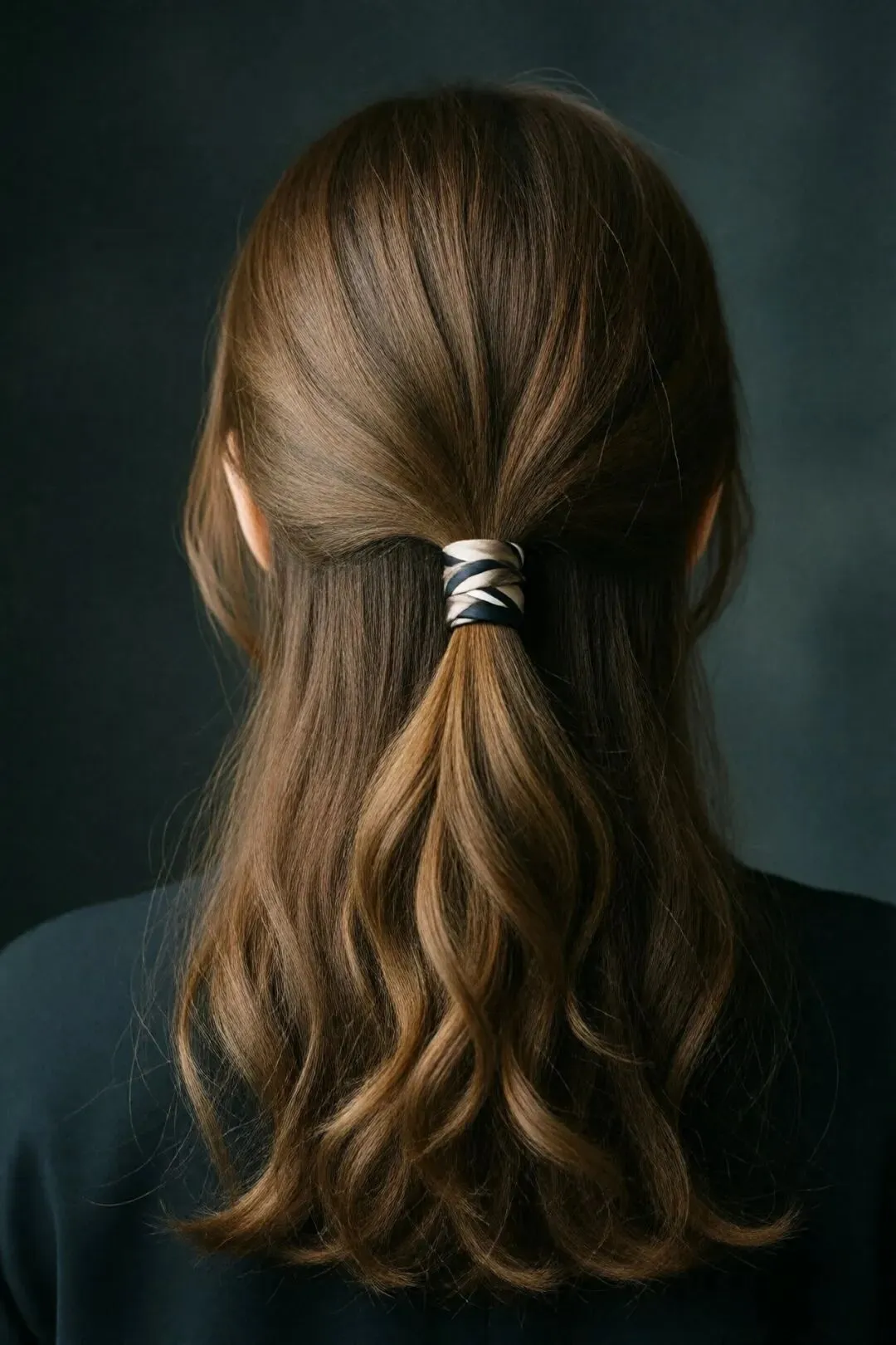only the upper half of the hair is gathered into a half-up arrangement at mid height, while the lower half remains down, not a full ponytail068. 丝绸丝巾半扎发