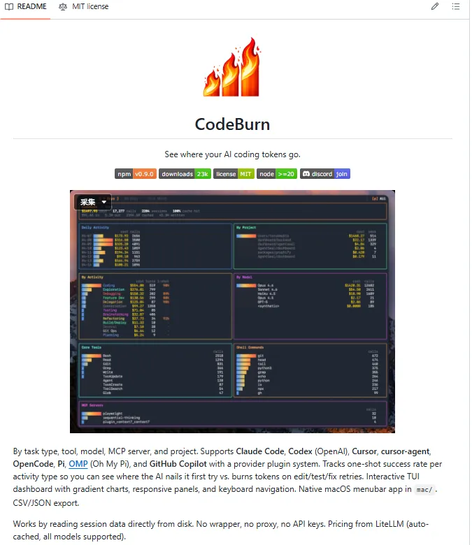 最近看到一个开源工具,叫 CodeBurn。