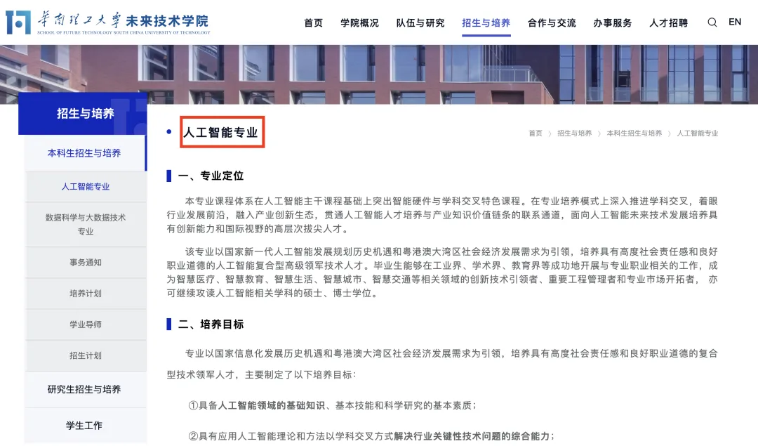 以华南理工大学人工智能专业为例,该方向主要培养面向算法、模型与智能系统开发的专业人才。就业方向主要包括:算法工程师、机器学习工程师、数据科学家,以及智能系统与 AI 应用开发等。像训练 AI 画图、做语音识别、开发自动驾驶的感知系统,都属于这类岗位。