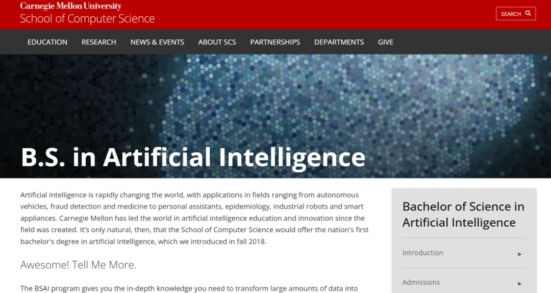 传统计算机科学专业,同样是进入 AI 行业的主流路径之一。作为一门基础性极强的专业,计算机涵盖后端开发、系统架构、安全、嵌入式、云计算等多个方向,而人工智能本身就是计算机科学的重要分支。计算机专业的学生可以通过选修 AI 相关课程、参与科研项目等方式,顺利转向 AI 领域。国外在这一领域已有成熟培养体系,例如卡内基梅隆大学就开设了人工智能学士学位(B.S. in Artificial Intelligence)。