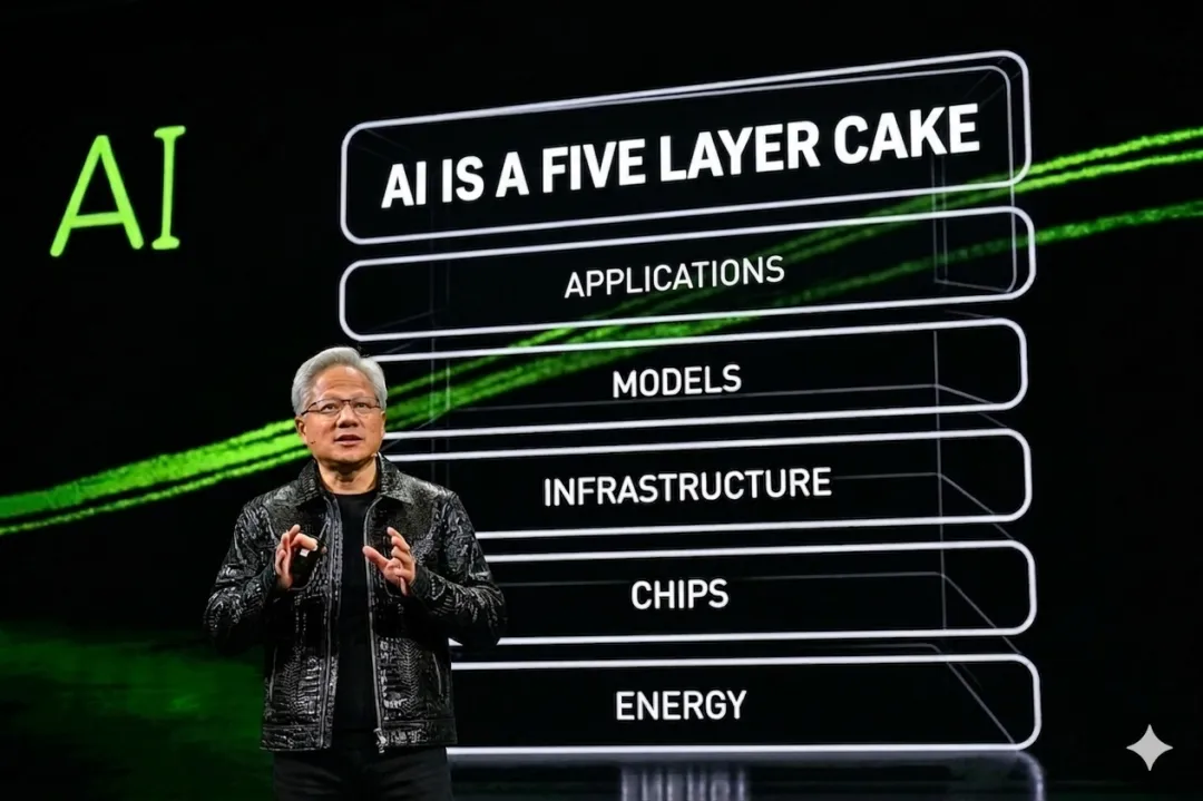 英伟达 CEO 黄仁勋用过一个非常形象的比喻:把 AI 产业看作自下而上的五层蛋糕。从最底层的基础支撑,到最顶层的实际应用,每一层环环相扣,共同推动整个产业运行,也对应着不同的专业和就业方向。这五层依次是: