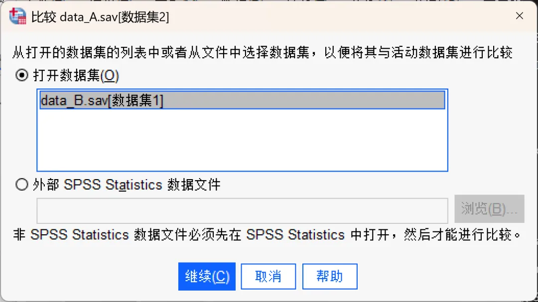 比较数据集功能主要用于将当前活动数据集与另一个已打开的数据集(或外部 .sav 文件)进行对比。它不仅能比较数据值,还能比较数据字典(如变量标签、值标签等)。主要用于: