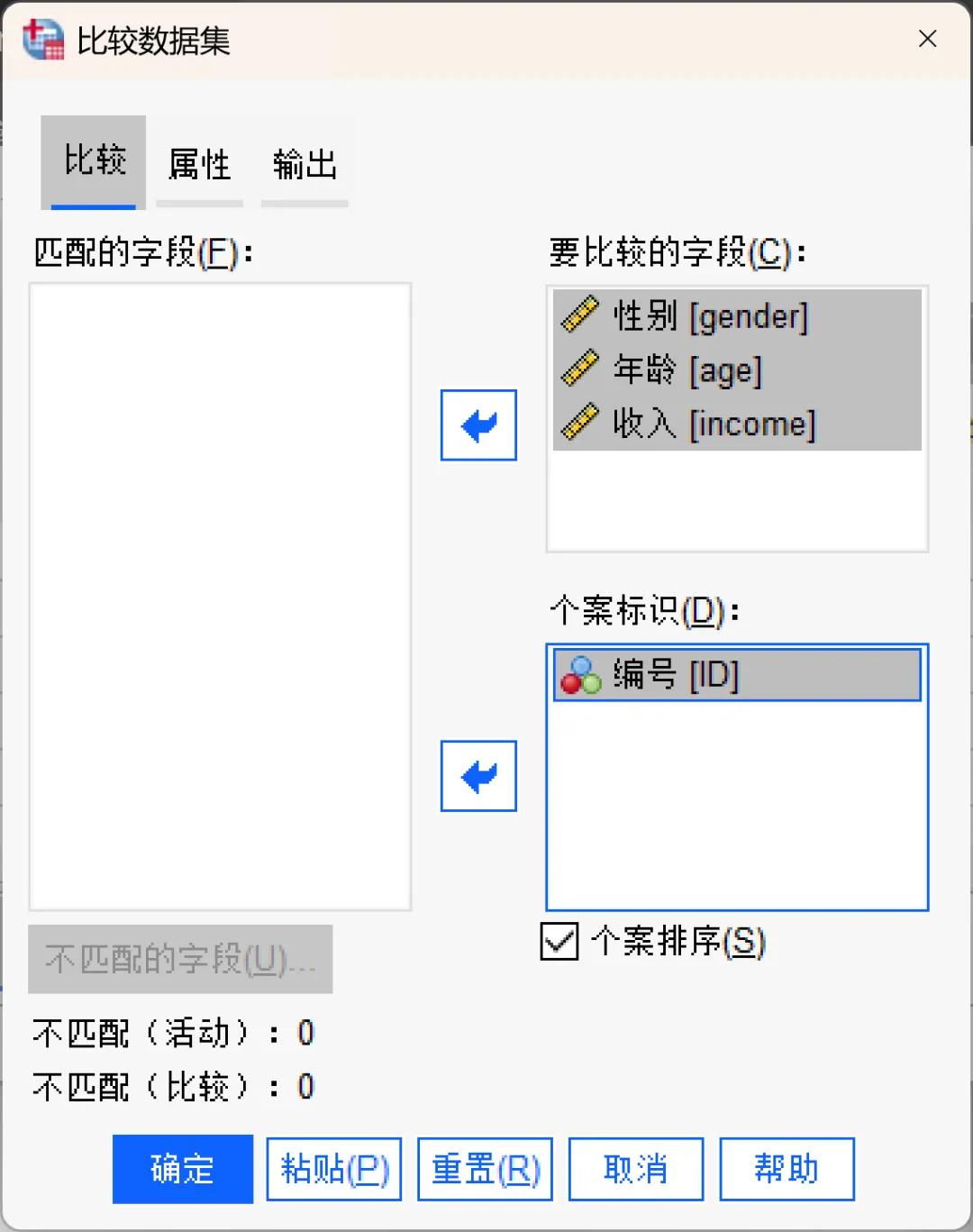 要比较的字段:对两个数据集的比较仅基于所选的一个或多个要比较的字段(变量)。
