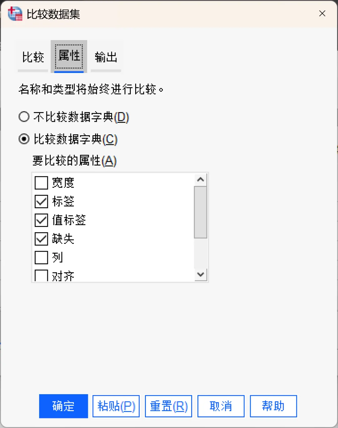 属性检查:检查两个数据集的变量属性(如测量尺度、缺失值定义)是否一致。