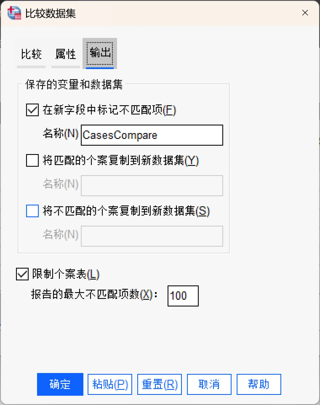 将不匹配的个案复制到新数据集:勾选后将创建一个新数据集,其中仅包含在另一个数据集中有不同值的活动数据集个案(记录)。