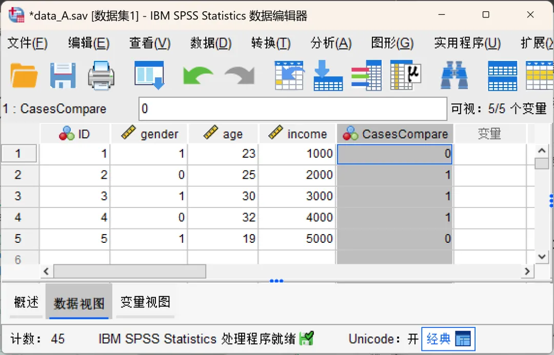 活动数据集中会增一个标识变量(默认名为CasesCompare),数值为1的个案就是存在差异的个案,本次示例中ID2、ID3、ID4对应的标识变量为1,精准定位存在差异的个案。