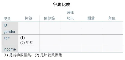 字典比较表格展示了两个数据集中变量的对比结果。该表仅在「属性」选项卡中勾选「比较数据字典」时才会出现。若无差异则显示空白,有差异会标注具体不同点(如 age 的标签不同)。