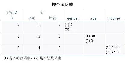 在新字段中标记不匹配项:在活动数据集中创建一个新字段来标识不匹配项。新字段的值为1表示存在差异;值为0表示所有值都相同;值为-1表示活动数据集中存在,但在另一个数据集中不存在的个案(记录)。