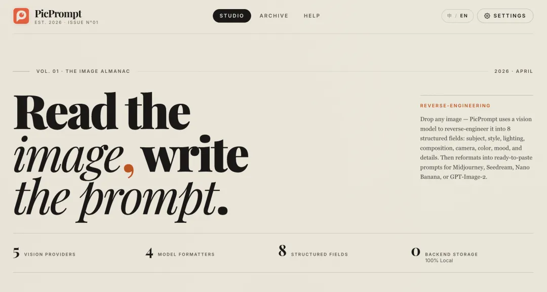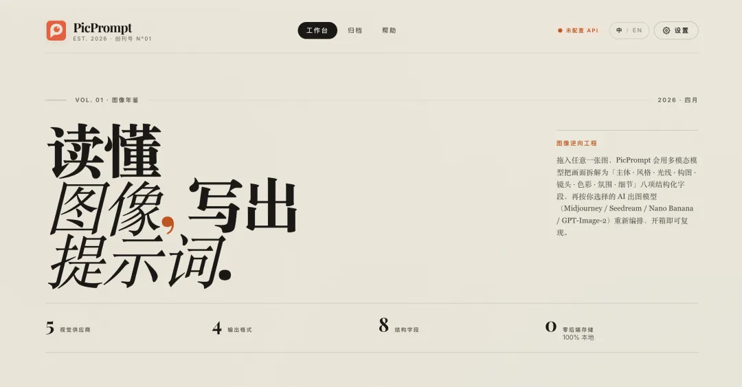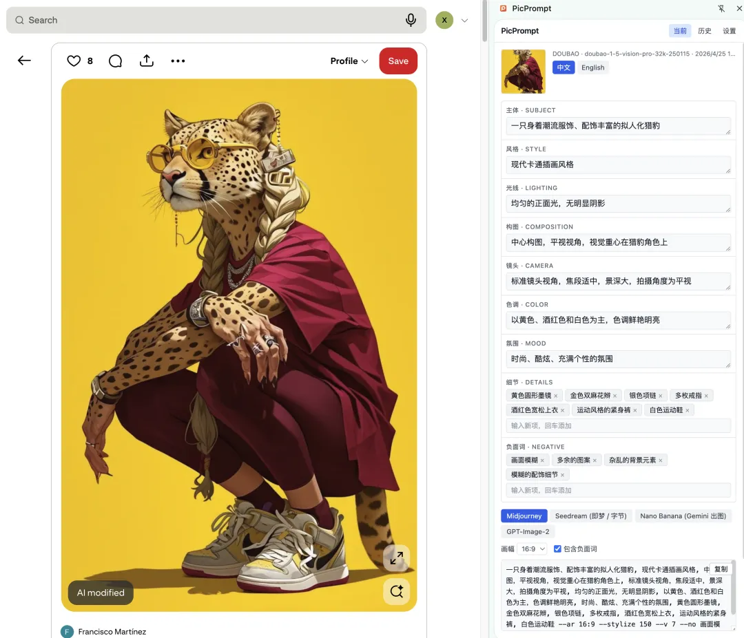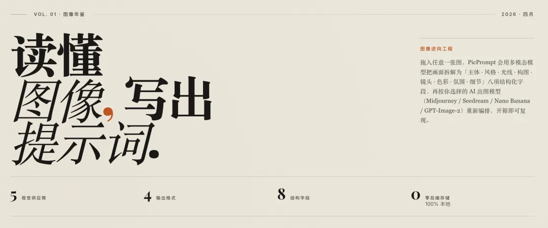 PicPrompt 会用视觉 AI 对图片进行多维度分析,并拆解成 8 个结构化字段: