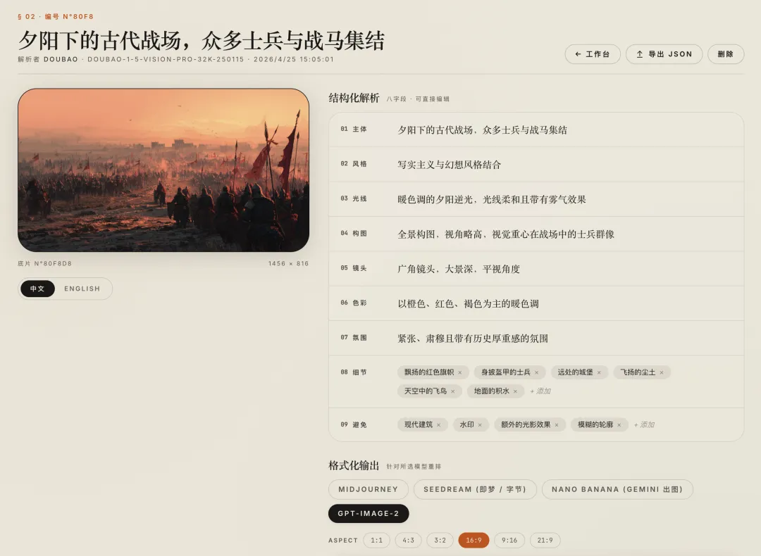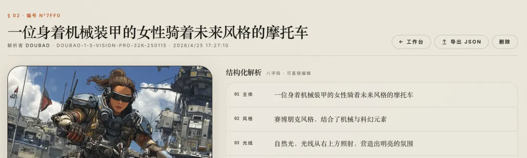 这一步完成后,我得到的不是一段普通描述,而是这张图片的结构化“基因图谱”。