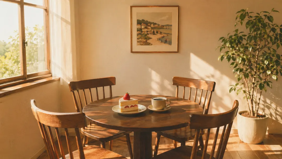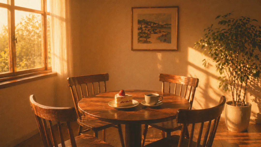16:9 宽屏画幅,日系胶片风格,带轻微过曝感,增强日系胶片质感风格画面。主体:摆放着咖啡和蛋糕的木质桌椅及周边室内环境。 构图:中心构图,平视视角,视觉重心在桌上的食物,标准镜头,中等焦段,增强浅景深虚化效果,水平拍摄角度。 光线:自然光从窗户侧面进入,暖色调,强化侧光氛围,有明显光影对比;色调:暖色调,以木色、米黄色为主,营造暖色午后感。 整体氛围:温馨、宁静、舒适。 画面需精确包含:(1) 一杯咖啡;(2) 一块带草莓的蛋糕;(3) 四把木质椅子;(4) 一幅挂在墙上的画;(5) 一盆绿植。 不要出现:”杂乱的物品”、”反光眩光”、”多余的人物”、”模糊的画面”、”不和谐的色彩”。