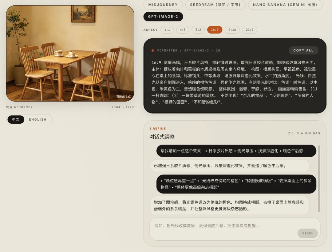 PicPrompt 会自动把刚才提取出来的结构化信息,重新组装成 GPT-Image-2 更适合理解的提示词格式:
