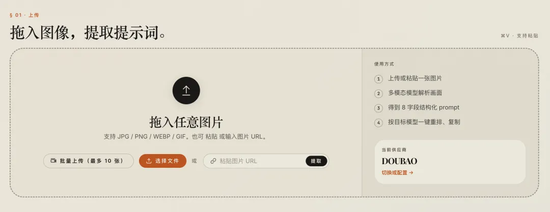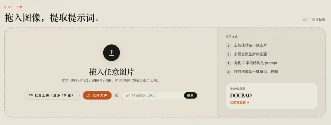 打开 picprompt.art,把图片直接拖进上传区域。