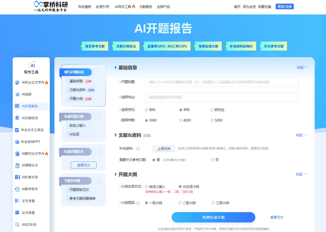 不过咱们还是需要提前搞清楚学校的要求,就拿我自己来说吧,我用的掌桥科研【AI开题报告】: