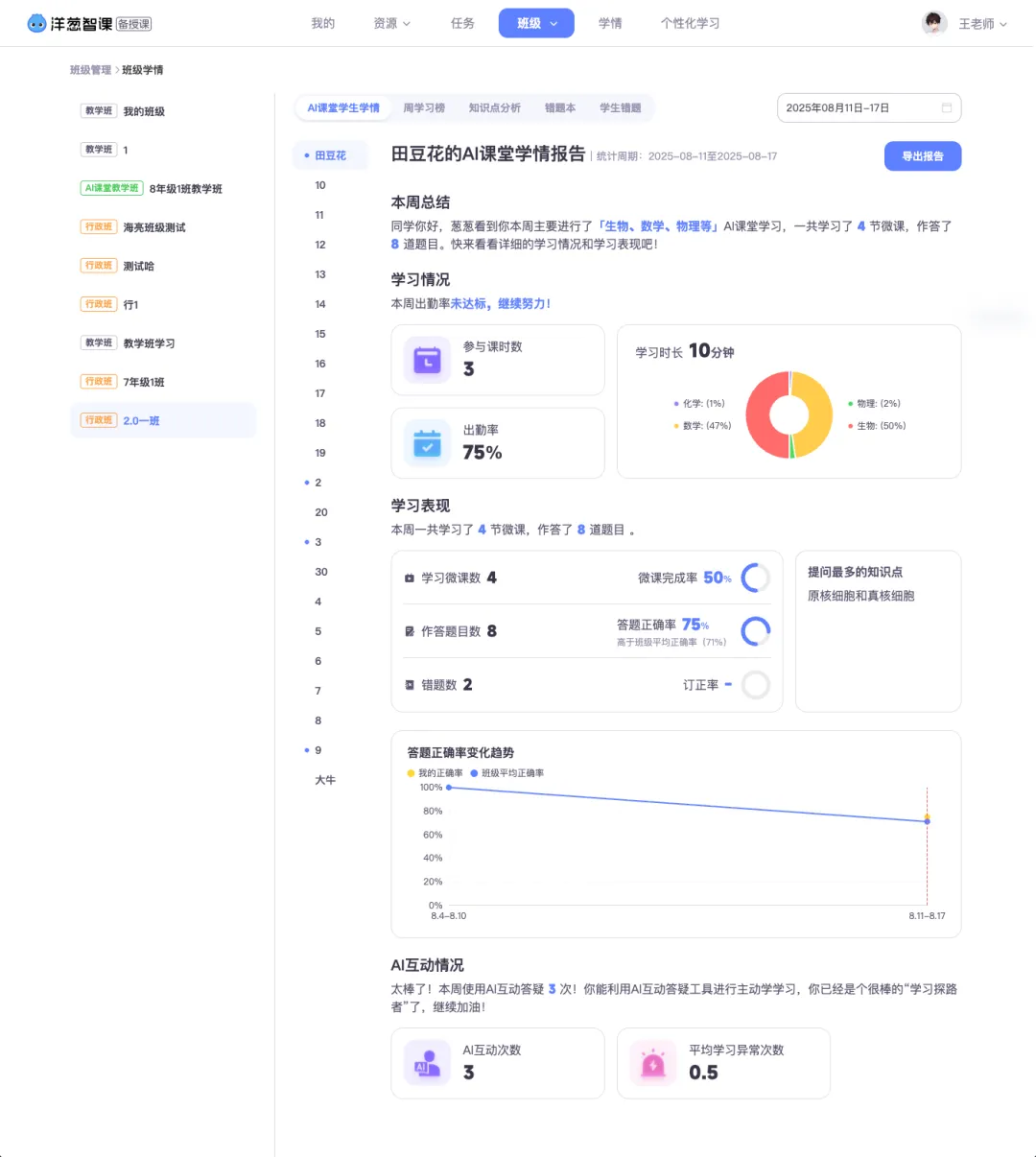 2. 完整的闭环:从“教”到“学”到“评”,从课堂到自习到课后,一套系统打通,不是拼凑的工具箱。