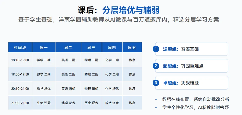 洋葱AI未来课堂覆盖课前学情诊断→课中互动教学→课后个性化辅导,全流程闭环,完美践行人机协同教学。
