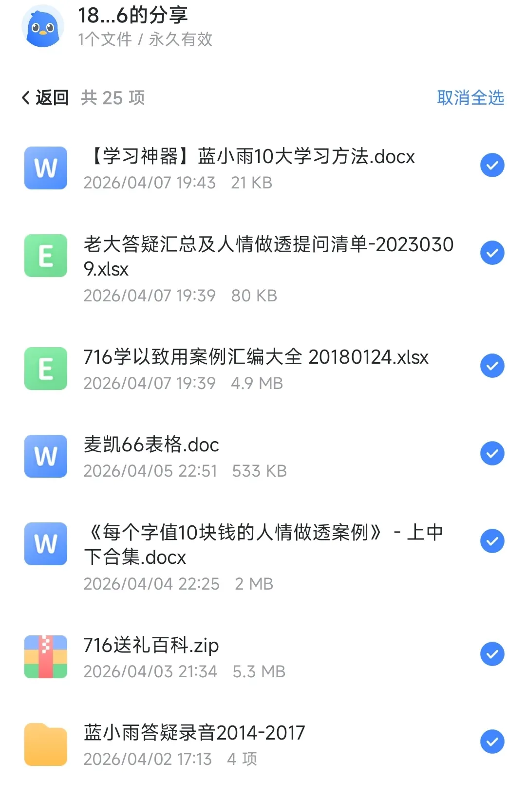 销售干货资料:《人情做透四招》案例文档+蓝小雨答疑录音/视频/(2014-2024)+716高手分享录音/视频