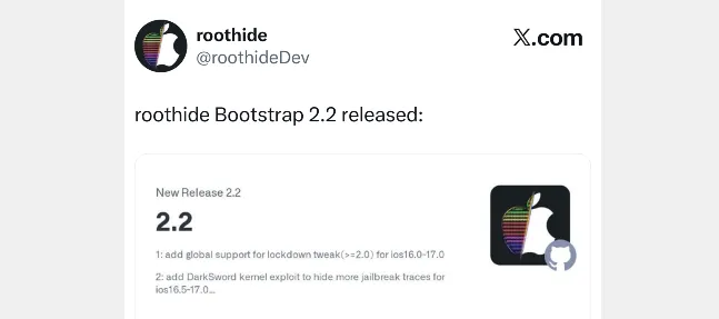 roothide 大佬针对 Bootstrap 半越狱更新,推出 2.2 版本,本次更新主要添加 DarkSword 核心漏洞利用,并且加强屏蔽越狱功能。