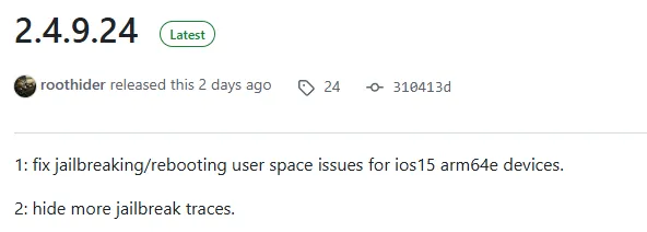 除了对 Bootstrap roothide 半越狱更新外,还对 Dopamine roothide 越狱更新,推出 2.4.9.24 版本,主要修复 iOS 15 arm64e 设备的越狱或重启用户空间的问题以及隐藏更多越狱痕迹。