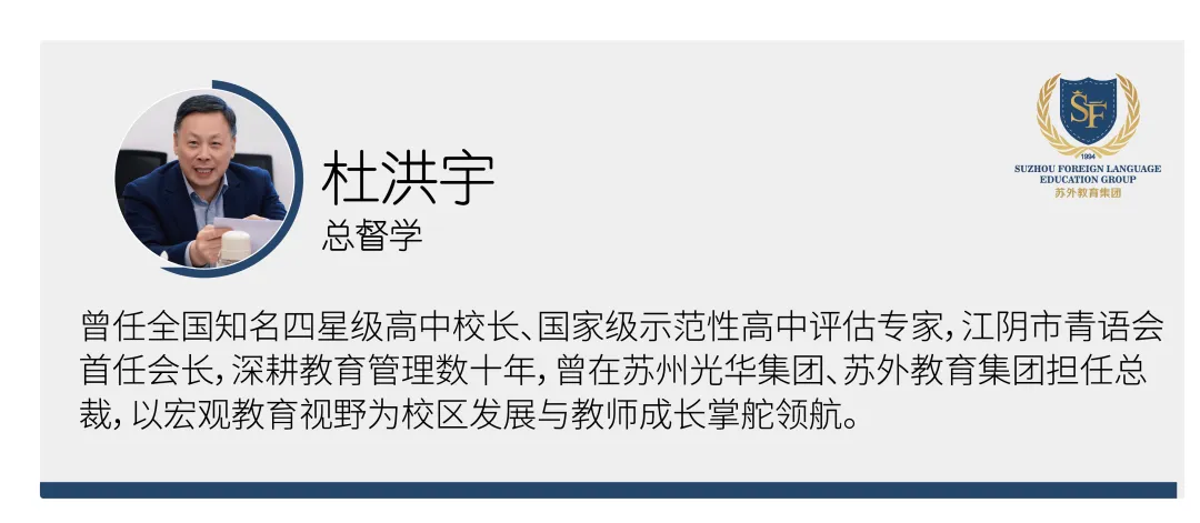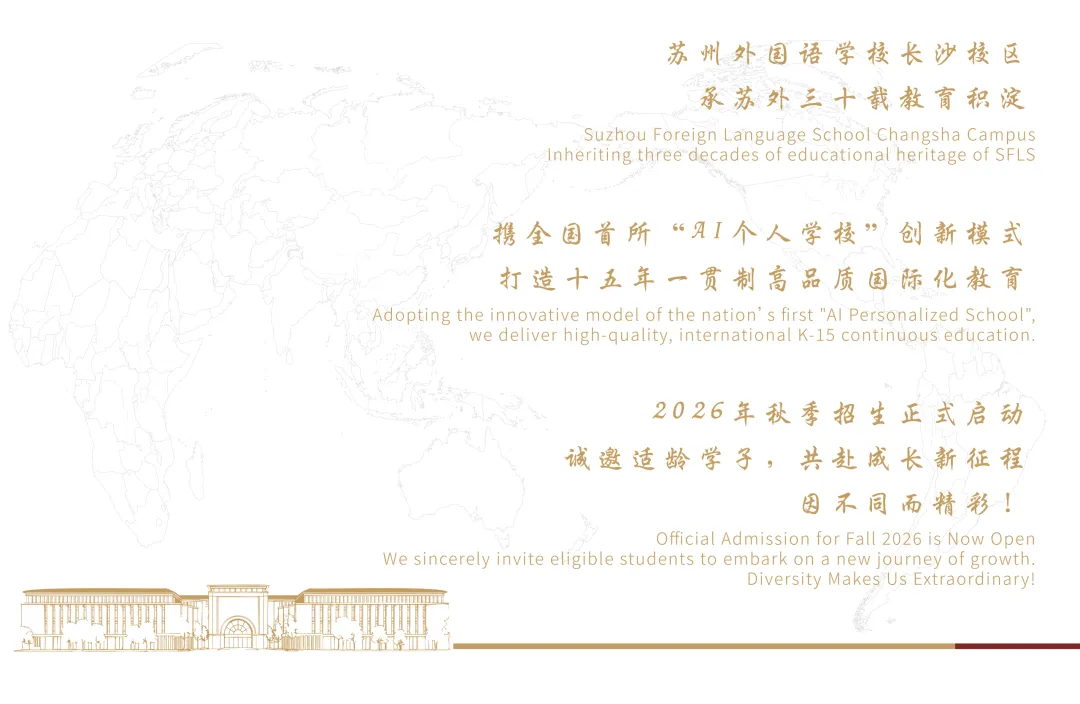 苏外教育集团是集学前教育、基础教育、高等教育、国际教育、境外修学、留学指导、外教引进及教育服务合作于一体的大型教育投资管理机构,与美国、英国、澳大利亚、加拿大、西班牙等多国名校建立深度合作。凭借差异化发展战略、多元国际化课程及双通道育人模式,培育了大批综合素质优异的国际化人才,铸就了独特的教育品牌与文化。集团先后荣获“2025年度综合影响力标杆教育集团”“中国国际学校30年颁奖盛典杰出贡献奖”,教育版图覆盖长三角及全国多地,构建起从学前到国际教育的完整教育链,为长沙校区提供坚实有力的集团资源支撑。