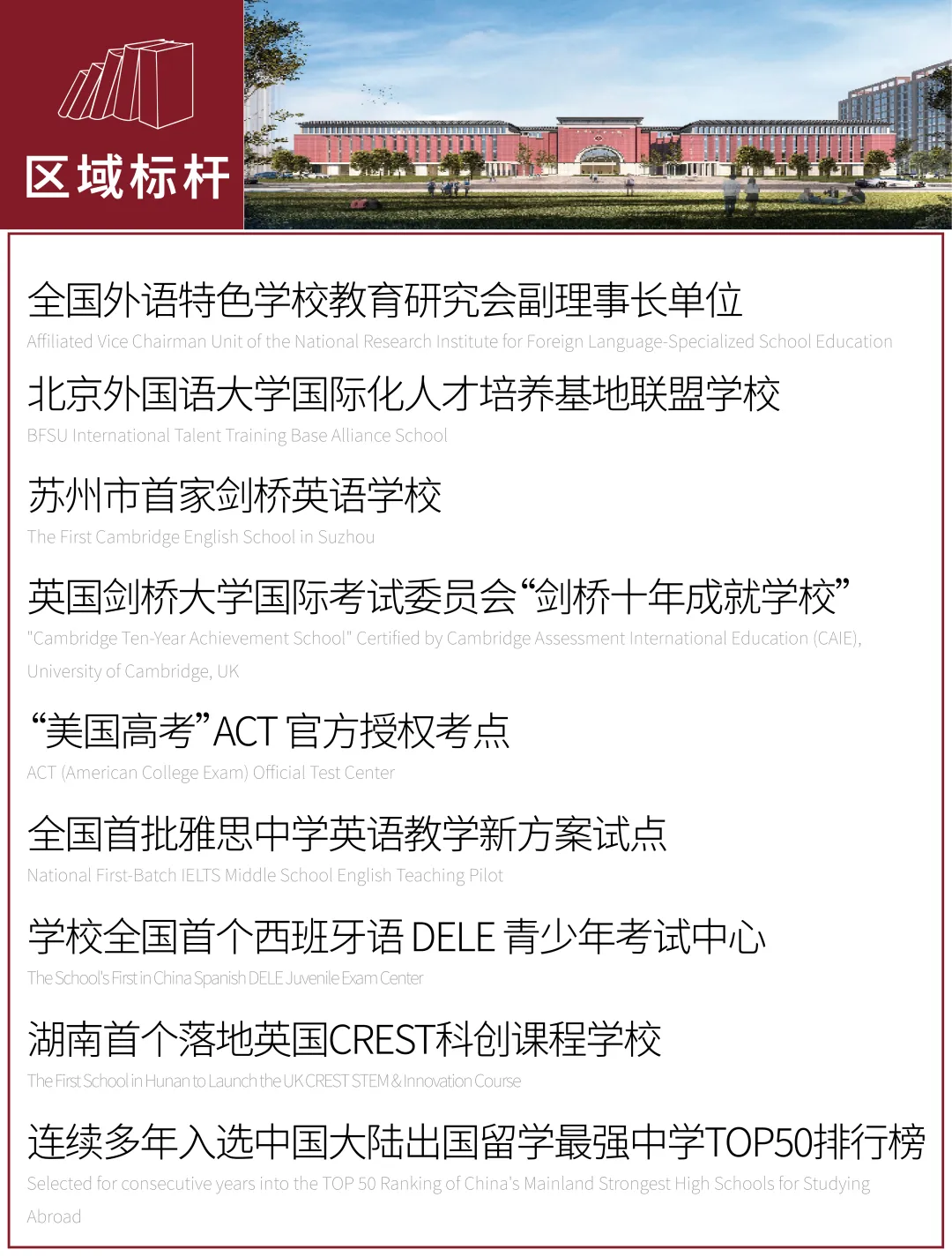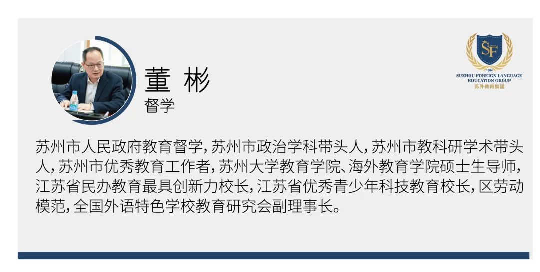 苏外本部创办于1994年,是苏州民办教育的领头羊、全国外语特色学校的排头兵,现有4000余名学生、700多名中外教职员工,斩获北外国际化人才培养基地联盟学校、南京大学优质生源基地等多项荣誉,连续多年进入中国大陆出国留学最强中学TOP50排行榜。