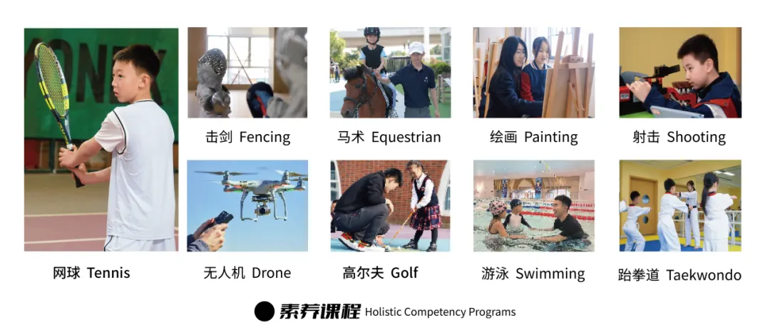 马术、高尔夫、射击、帆船、数理思维、跆拳道、皮划艇、网球、滑雪、飞行、机器人搭建、编程、3D打印、国学、戏剧、财商、游泳等一系列丰富的素养课程。