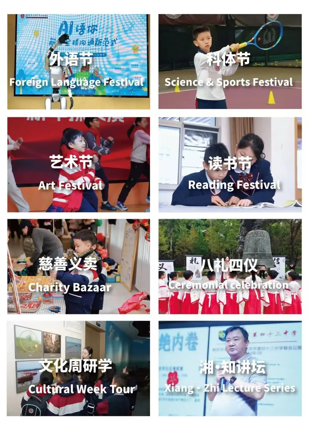 打造外语节、科体节、艺术节、读书节四大品牌节日,开展“八礼四仪”、湘·知讲坛、研学交流等特色活动,同时建立完善的家校沟通机制,通过校长开放日、专题家长会等形式,形成育人合力。