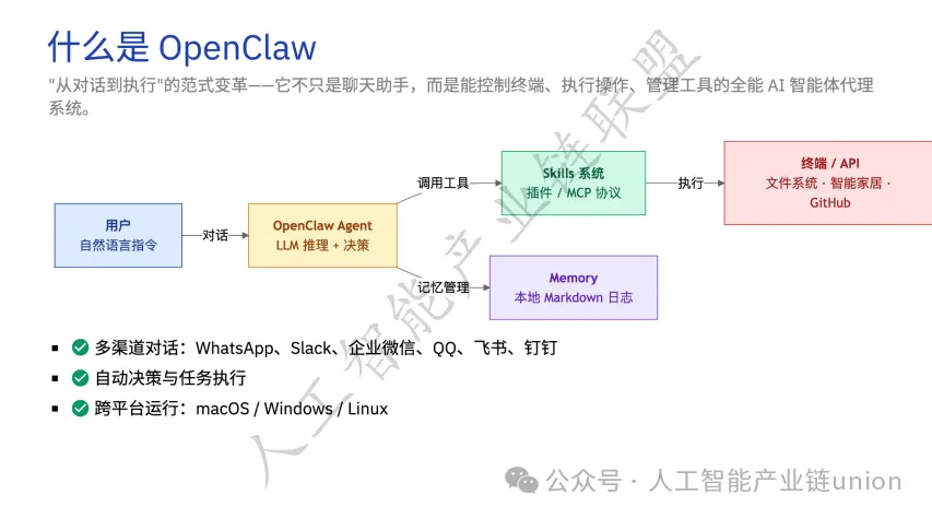 OpenClaw的核心定位,是“从对话到执行”的范式变革。它并非一个简单的聊天机器人,而是一个能控制终端、执行操作、管理工具的全能AI智能体代理系统。