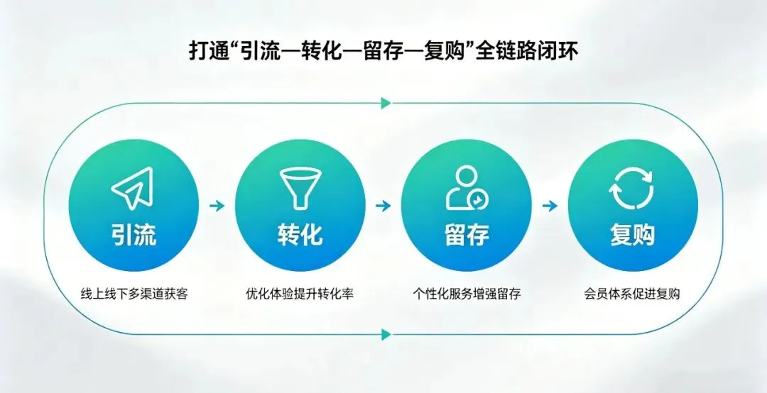 打通 “引流—转化—留存—复购” 全链路闭环,让门店从单次交易经营,走向长期用户经营。