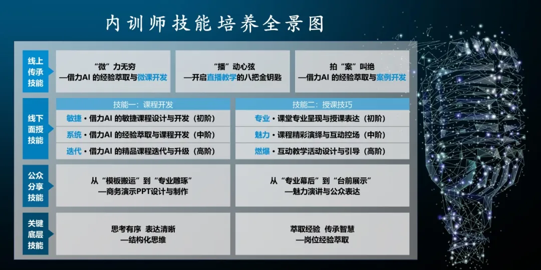 (二)借力AI提质增效。借助AI的赋能,内训师能够高效实现:课题需求分析、内容架构搭建、教学方法设计、课件ppt设计等等操作,节约讲师时间的同时,提升课程开发的效率和质量。