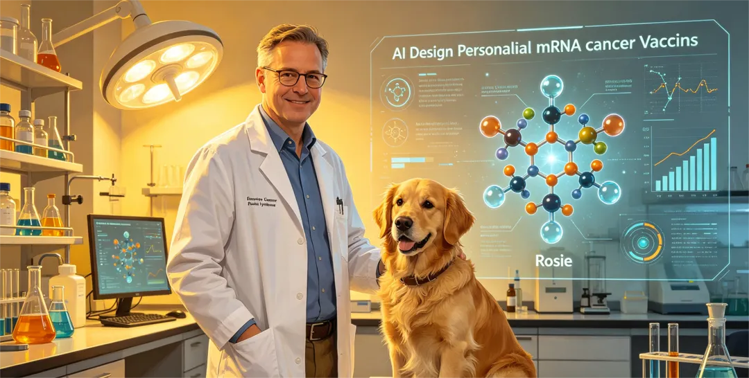 在所有这些宏大发展的背后,来自澳大利亚的工程师Paul Conyngham借助AI工具为自己罹患晚期肥大细胞癌的爱犬Rosie完成了全基因组测序。他仅用3000澳元就取得了测序数据,然后借助AlphaFold预测突变蛋白结构,再用生成式AI设计出新抗原靶点,最终与大学合作研发出全球首款犬类个性化mRNA癌症疫苗。