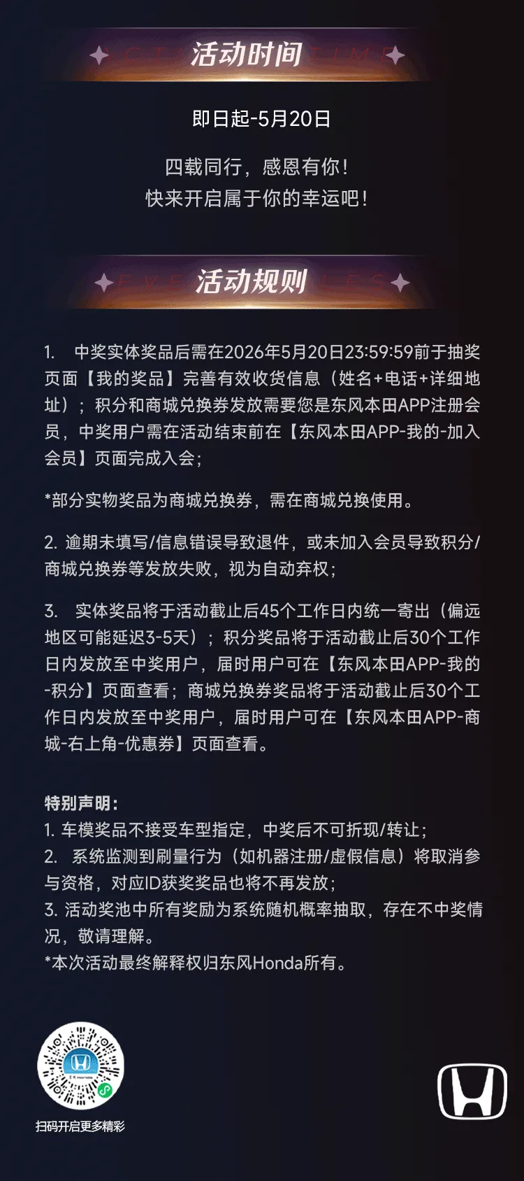 【温州鸿大】东风本田APP四周年 感恩回馈开启! 东风本田温州鸿大店 扫一扫下方二维码即可关注,不定期免费送送送 温州鸿大东风本田4S店 温州市区授权东本4S店 温州鸿大东本 销售热线:0577-5685 5555 温州鸿大东本 服务热线:0577-5665 0888 温州鸿大东本24小时救援电话:189 6889 5995 地址:温州市鹿城区温州华誉汽车文化园9幢916号