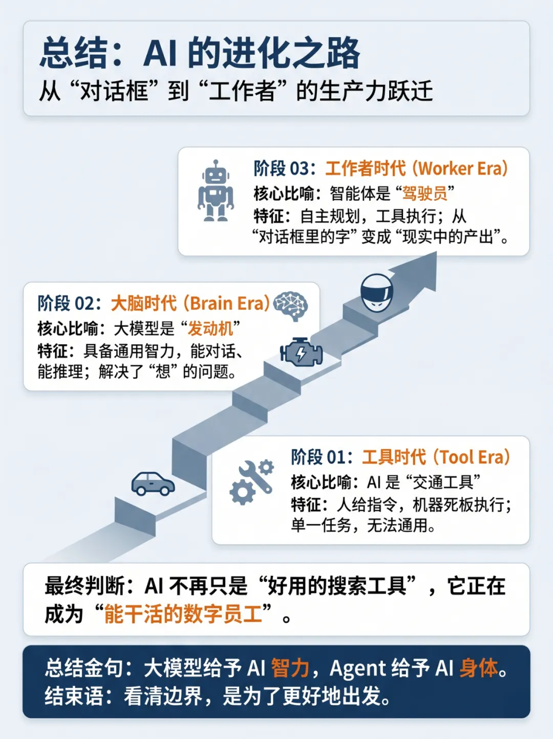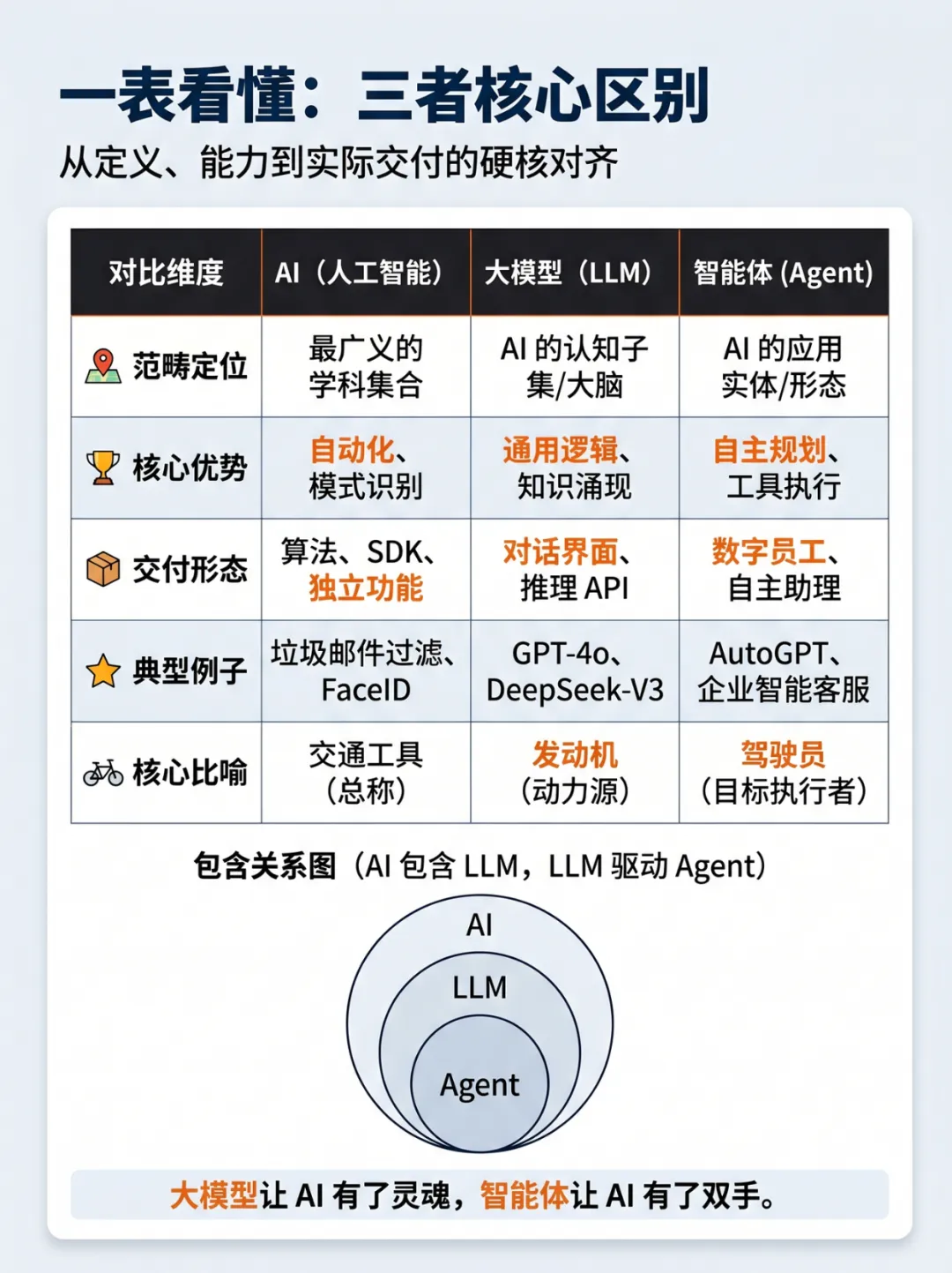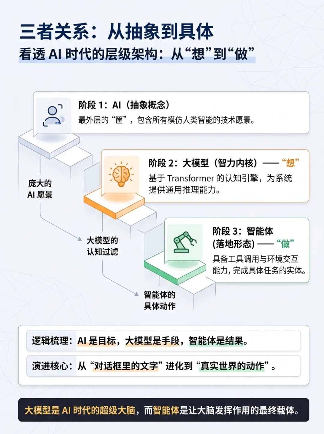 用通俗比喻和硬核对比,一次性讲清三者的定义、区别与演进关系,从 “交通工具” 到 “发动机” 再到 “驾驶员”,帮你彻底理清 AI 时代的底层认知地图,拒绝概念内耗