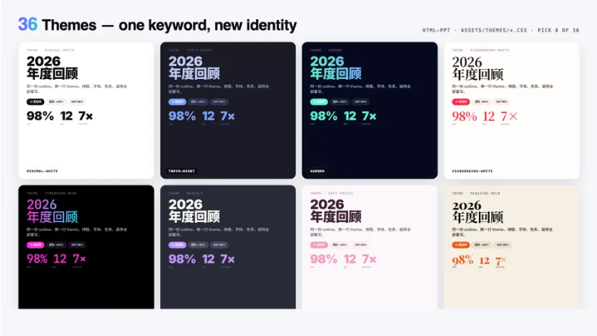 🔮 36 种设计主题 | 📑 31 种页面布局 ✨ 47 种动画效果(27 CSS + 20 Canvas FX) 🎯 15 套完整PPT模板