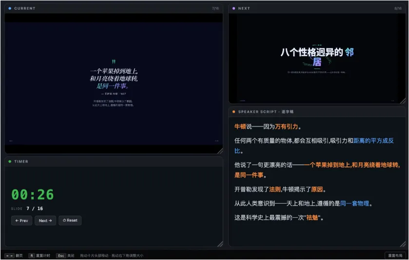 按S键弹出独立窗口,磁贴式显示:当前页 · 下一页预览 · 逐字稿(150-300字/页) · 计时器。通过BroadcastChannel与主窗口实时同步,演讲体验非常流畅。