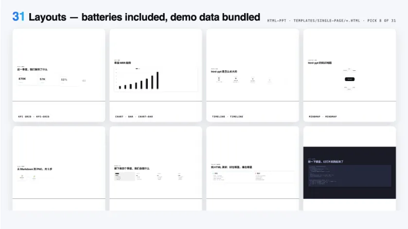 cover · toc · bullets · two-column · three-column · big-quote · stat-highlight · kpi-grid · table · code · terminal · flow-diagram · timeline · roadmap · mindmap · gantt · image-hero · chart-bar · chart-line · arch-diagram · cta · thanks …… 基本上涵盖了你做PPT需要的所有版式。