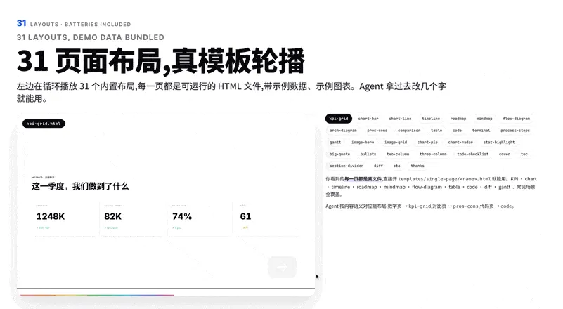 一个AgentSkill工具,通过自然语言指令让AI生成专业级HTML演示文稿。纯静态文件无需构建步骤,一行命令安装,任何支持AgentSkills的AI助手都能用。