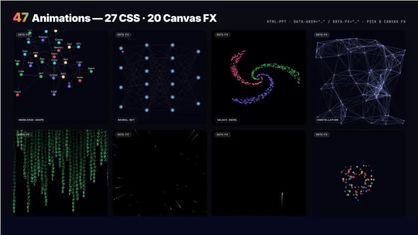 Canvas FX(20种cinematic特效):particle-burst · confetti-cannon · firework · starfield · matrix-rain · knowledge-graph(力导向知识图谱) · neural-net · galaxy-swirl · word-cascade