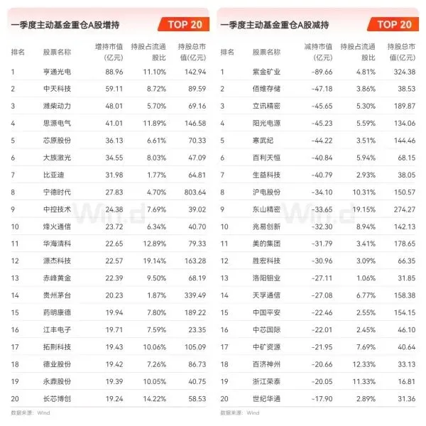 值得注意的是,贵州茅台和药明康德也获增持,但排名相对靠后。整体来看,一季度基金增持方向高度集中在光通信、电力设备、半导体设备及部分周期资源品领域。
