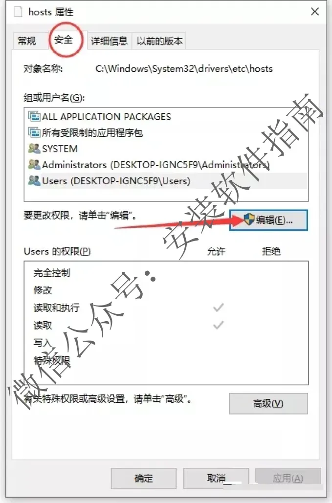 10.找到并选中你所在的组(一般为Users…若不是,再试其他的)。把下面的所有权限都勾上(建议在顺利修改保存了hosts文件以后,再将刚才新勾选的权限取消)。确定。
