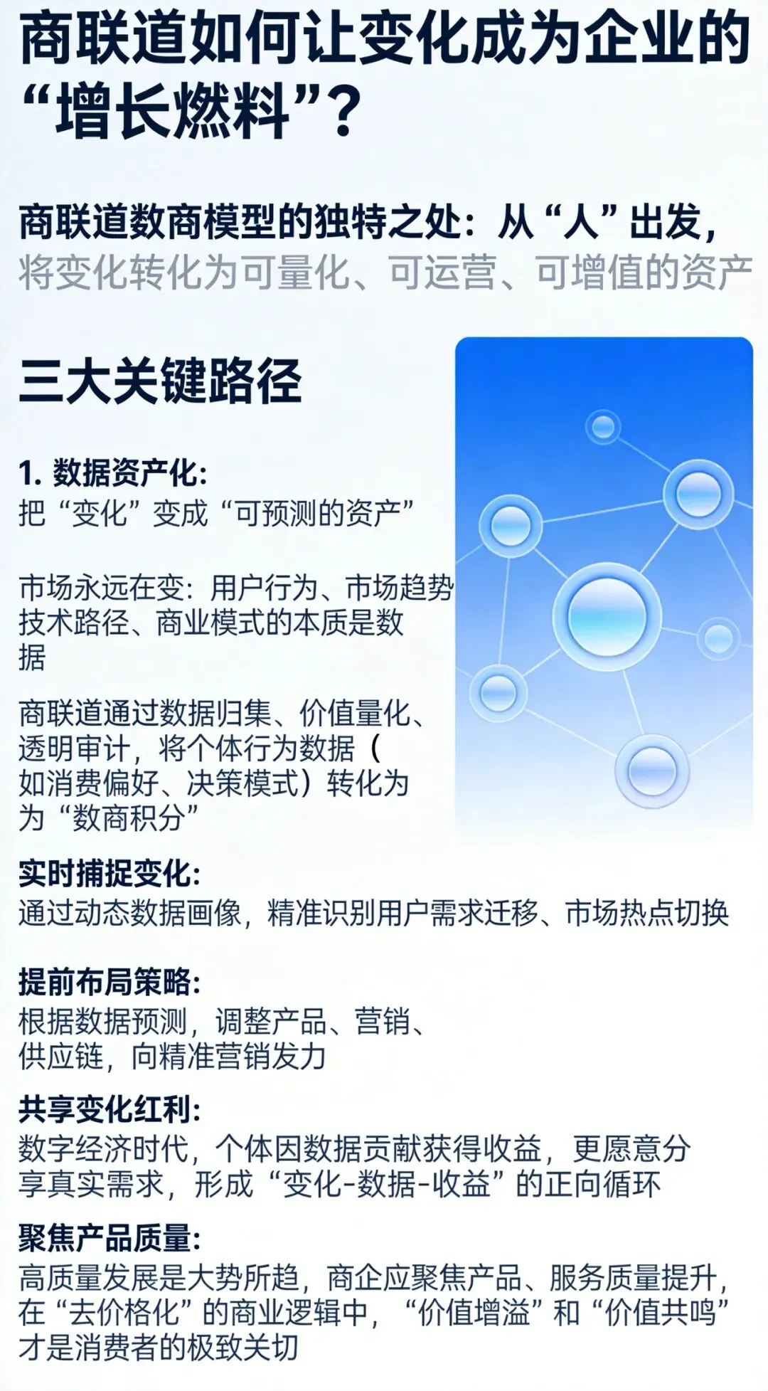 变化的本质,不是威胁,是温情、是机会。商联道数商模型的核心,正是通过数据驱动、算法赋能、生态协同,将“变化”转化为企业的“增长引擎”。它告诉我们: