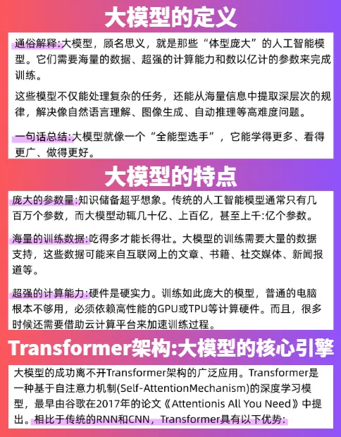 其实大模型的底层原理一点都不复杂,没大家想的那么高深。核心就是先用海量的文字数据做训练,靠 Transformer 这套基础框架运行。再通过文字转数字、理解上下文、预判下一个字词这些简单机制,实现聊天写作、生成内容、简单推理这些功能。