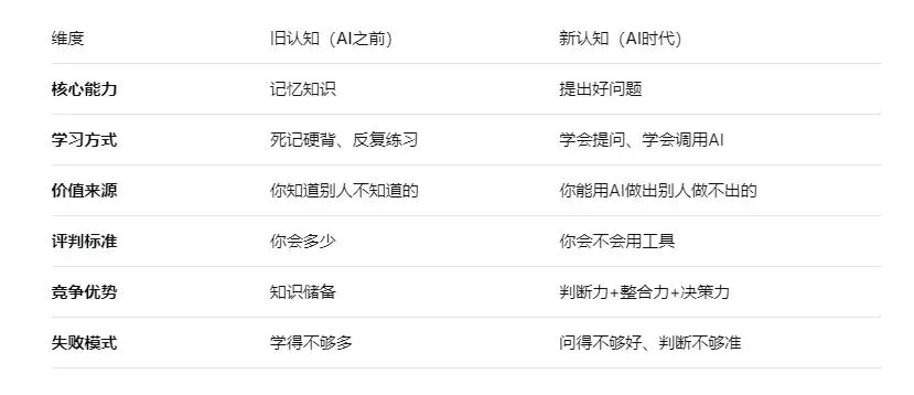 01 先搞清楚:什么是AI时代的“认知”?过去,我们说的“认知”,很大程度上等于“知道什么”。· 知道多少知识点· 知道多少方法论· 知道多少行业经验知识越多,认知越高。但AI来了之后,“知道什么”这件事,变得不值钱了。任何一款AI知道的东西,比全世界任何一个人都多。它能背出所有历史事件的日期,能解释任何科学概念,能写出各种代码框架。你跟AI比“知道”,你永远赢不了。所以,AI时代的认知,不再是“知道什么”,而是:第一,问出好问题的能力。AI能回答任何问题,但前提是——你得会问。你不会问,它就给你一个平庸的答案。你会问,它就能帮你挖出金子。问问题的能力,决定了你从AI那里得到什么。第二,判断信息真假、好坏、轻重的能力。AI会犯错,会胡说八道,会给出一堆正确的废话。你得有能力判断:这个答案靠谱吗?这个信息重要吗?这个建议适合我吗?这是批判性思维。第三,把碎片整合成系统的能力。AI擅长生成碎片:一段代码、一篇文章、一个方案。但把这些碎片组合成一个完整的、可执行的、有灵魂的系统,还是得靠人。这是整合能力。第四,做决策的能力。AI可以给你十个选项,分析每个选项的利弊。但最后拍板的,是你。因为你承担后果。决策能力,是AI永远无法替代的——因为它不用负责。