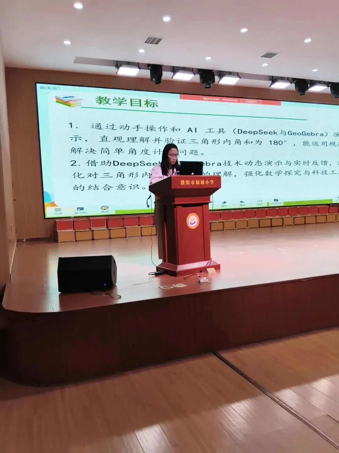 四年级郭会方老师以《三角形的内角和》为例,分享AI赋能数学课堂实践。借助DeepSeek定制教学工具与GeoGebra动态几何软件,通过拖拽变形、实时显示角度、自动求和,直观验证三角形内角和为180°。课堂设置画、量、拼、折等操作活动,结合AI动态演示与即时反馈,突破抽象难点,提升探究兴趣与理解深度。AI助力数学可视化学习,强化空间观念与推理能力,让数学课堂更高效、更智能。