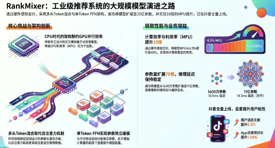 本文将深度拆解字节跳动提出的全新硬件感知推荐架构——RankMixer。该架构彻底摒弃了 CPU 时代遗留的复杂特征交叉模块,通过首创的无参数多头 Token 混合(Multi-head Token Mixing)、独立 Token 专属前馈网络(Per-token FFN)以及动态稀疏混合专家系统(Sparse-MoE),在抖音真实大盘中实现了惊人的工程奇迹:将模型参数量扩大两个数量级(超过 10 亿),MFU 从 4.5% 暴涨至 45%,且在线推理延迟几乎保持不变!这标志着推荐系统正式迈入了 GPU 高效并行的基础大模型时代。