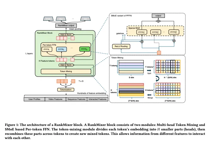 本节我们将以结构化的方式,自底向上地拆解 RankMixer 极具工程美学的内部工作流(结合论文 Figure 1)。