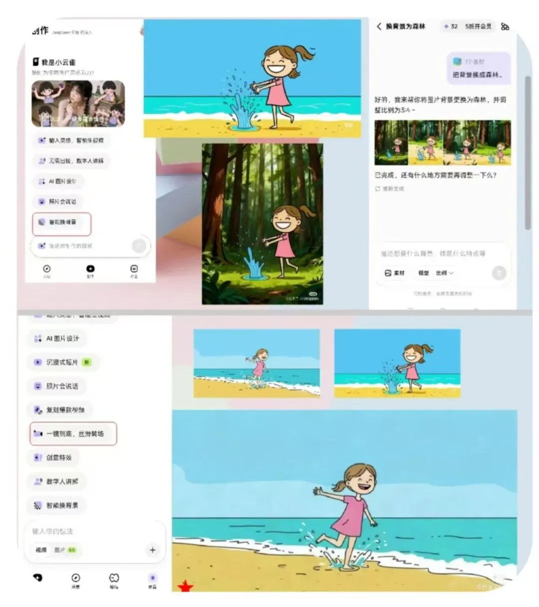 小云雀的AI创意功能,为老师们打开了教学素材创作的新大门:输入教学场景描述,就能生成贴合课文情境的插画、示意图;把静态图片一键转化为动态短片,搭配转场特效,快速制作课堂导入视频;还有智能换背景、丝滑转场等功能,让零基础老师也能做出专业级的教学创意短视频。